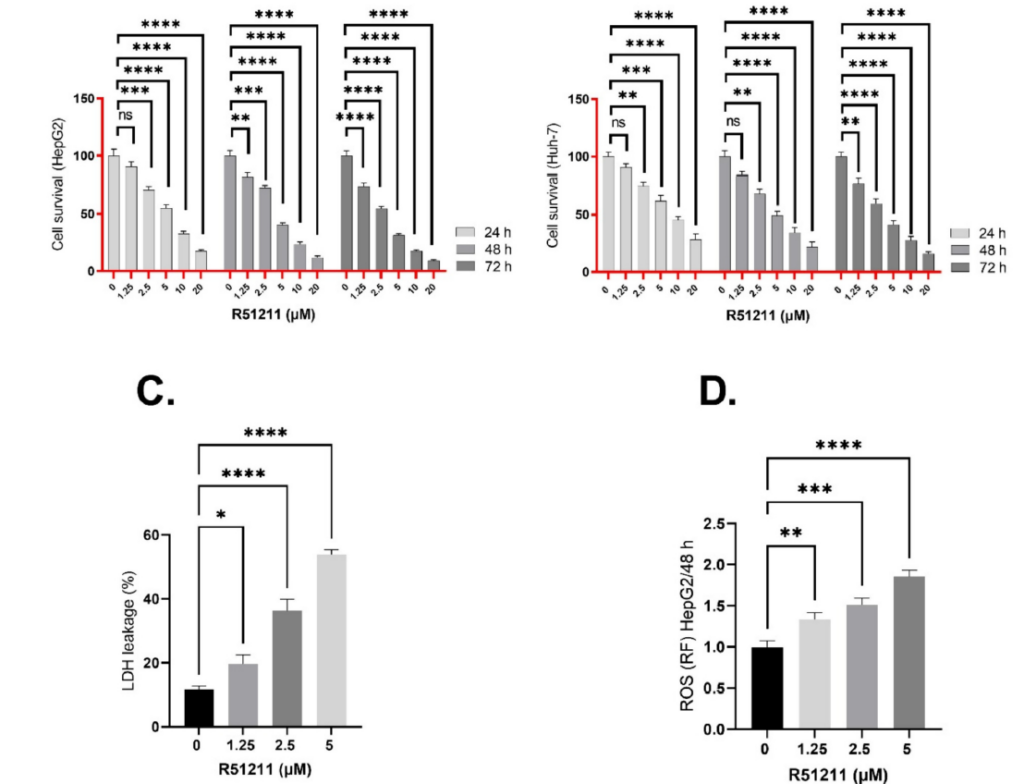 Effect of R51211 on HepG2 cell proliferation (A), Huh-7 cell proliferation (B), LDH leakage (C), and intracellular ROS production (D). Copyright Simona Cavalu et al.